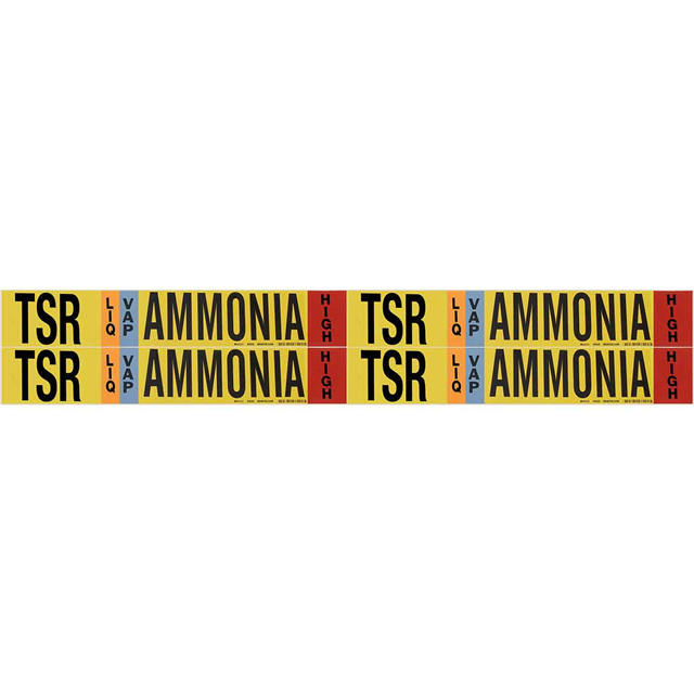 Description: AMMONIA (IIAR) PIPE MARKERSPackaging: Bulk Mounting Type: Adhesive, Permanent Length: 7.000" (177.80mm) Shape: Rectangle Width: 1.125" (28.58mm) Material - Body: Vinyl Applications: General Color - Background: Yellow Location: Outdoor Language: English Application Specifics: Notice Arrangement: Text Only Legend (Text): TSR Ammonia Legend (Symbol Only): No Symbol Color - Legend: Black, Blue, Orange, Red Outside Pipe Diameter (Min): 2.375" (60.33mm) Outside Pipe Diameter (Max): 0.750" (19.05mm) 3/4" Print Type: Pre-Printed |