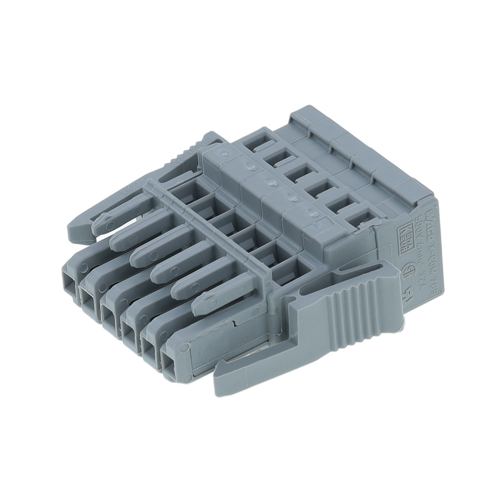 Description: TERM BLOCK PLUG 6POS 5MM, Features: Lever Actuated, Retention Latches (Non-Wire Side), Packaging: Box, Color: Gray, Mounting Type: Free Hanging (In-Line), Number of Positions: 6, Pitch: 0.197" (5.00mm), Type: Plug, Female Sockets, Termination Style: Screwless - Push-In Spring, Current - IEC: 32A, Number of Levels: 1 (Mate), 2 (Input), Wire Gauge or Range - AWG: 12-28 AWG, Wire Gauge or Range - mm²: 0.08-4mm², Positions Per Level: 6, Plug Wire Entry: 180°, Part Status: Active, Voltage - IEC: 500 V.