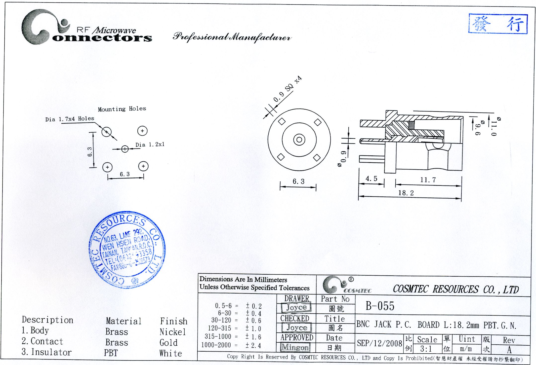 Produkte > Steckverbinder, Reihenklemmen > Steckverbindungen Hochfrequenz > B-055 (BNC-J) (HF-Jack) Cosmtec
