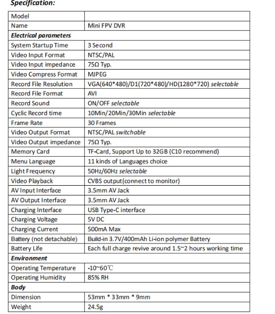 Hersteller: Beschreibung: Портативний відеореєстратор FPV. Формат відео на виході: NTSC/PAL. Вхідний опір відео: 75 Ом (типовий). Формат стиснення відео: MJPEG. Роздільна здатність запису: VGA (640×480) / D1 (720×480) / HD (1280×720). Формат файлу відео запису: AVI. Запис звуку. Циклічний запис: 10 хв / 20 хв / 30 хв. Кадрова частота: 30 кадрів/с. Карта пам’яті: microSD (до 32 ГБ, рекомендовано клас 10). Відтворення відео: CVBS вихід. Аудіо вхід/вихід: роз'єм 3.5 мм AV. Інтерфейс заряджання: USB-type C. Акумулятор: вбудований 3,7V / 400 mAh. Час роботи: 1,5…2 години. Високоточний 4-рівневий індикатор заряду. Габарити: 53×33×9 мм. Вага:24,5g.