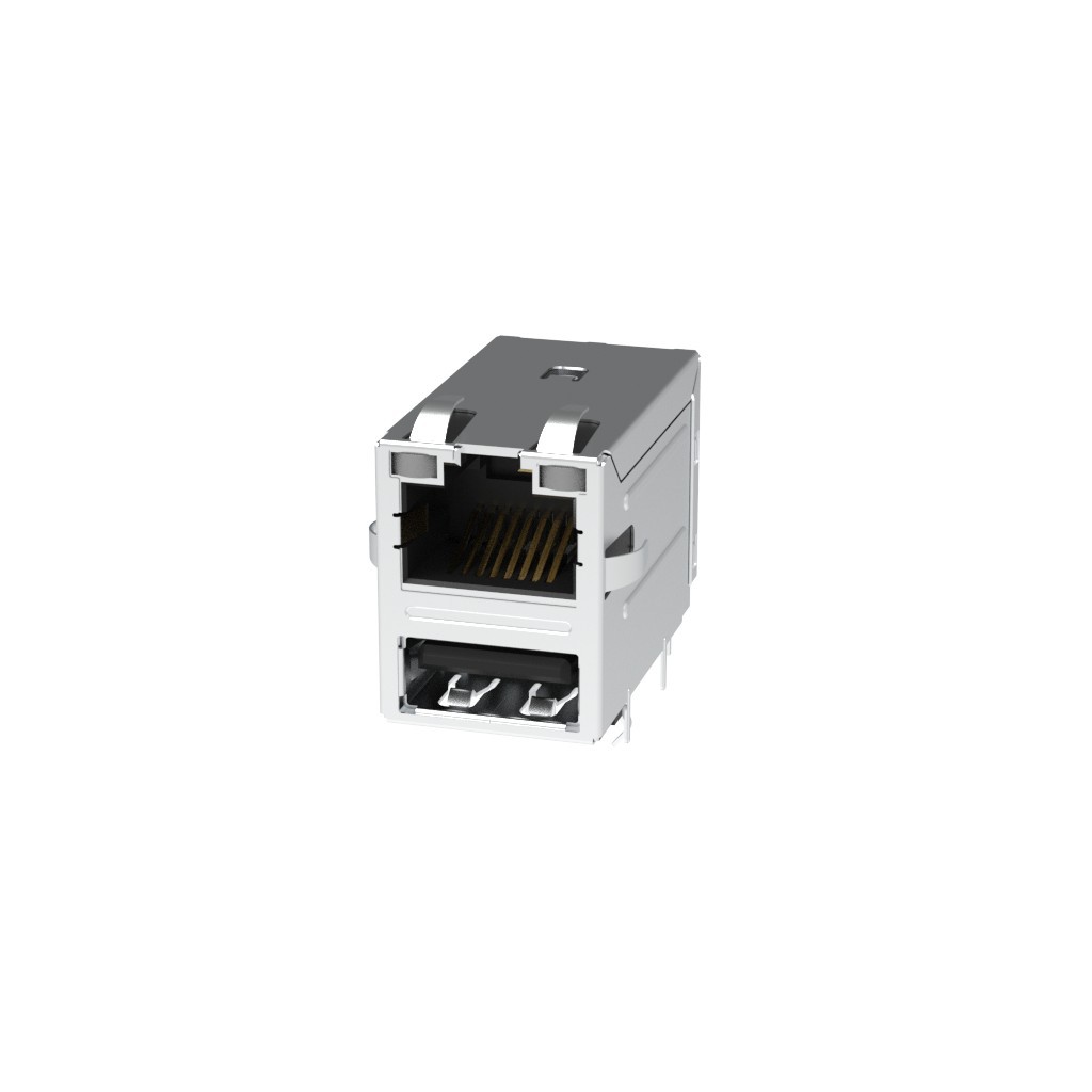 Description: RJMG 10/100 STACK SINGLE USB 2.0, Features: Board Lock, Packaging: Tray, Connector Type: RJ45 with USB A, Contact Finish: Gold, Mounting Type: Through Hole, Shielding: Shielded, EMI Finger, Orientation: 90° Angle (Right), Operating Temperature: 0°C ~ 70°C, Applications: 10/100 Base-TX, AutoMDIX, Termination: Solder, LED Color: Green, Orange - Green, Orange, Number of Cores per Jack: 4, Height Above Board: 0.831" (21.10mm), Tab Direction: Up, Contact Material: Phosphor Bronze, Number of Ports: 1, Number of Rows: 1.