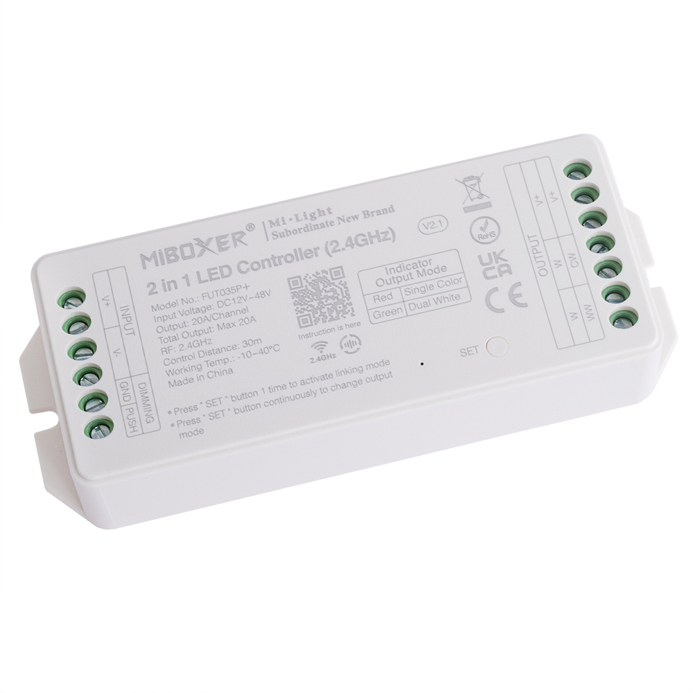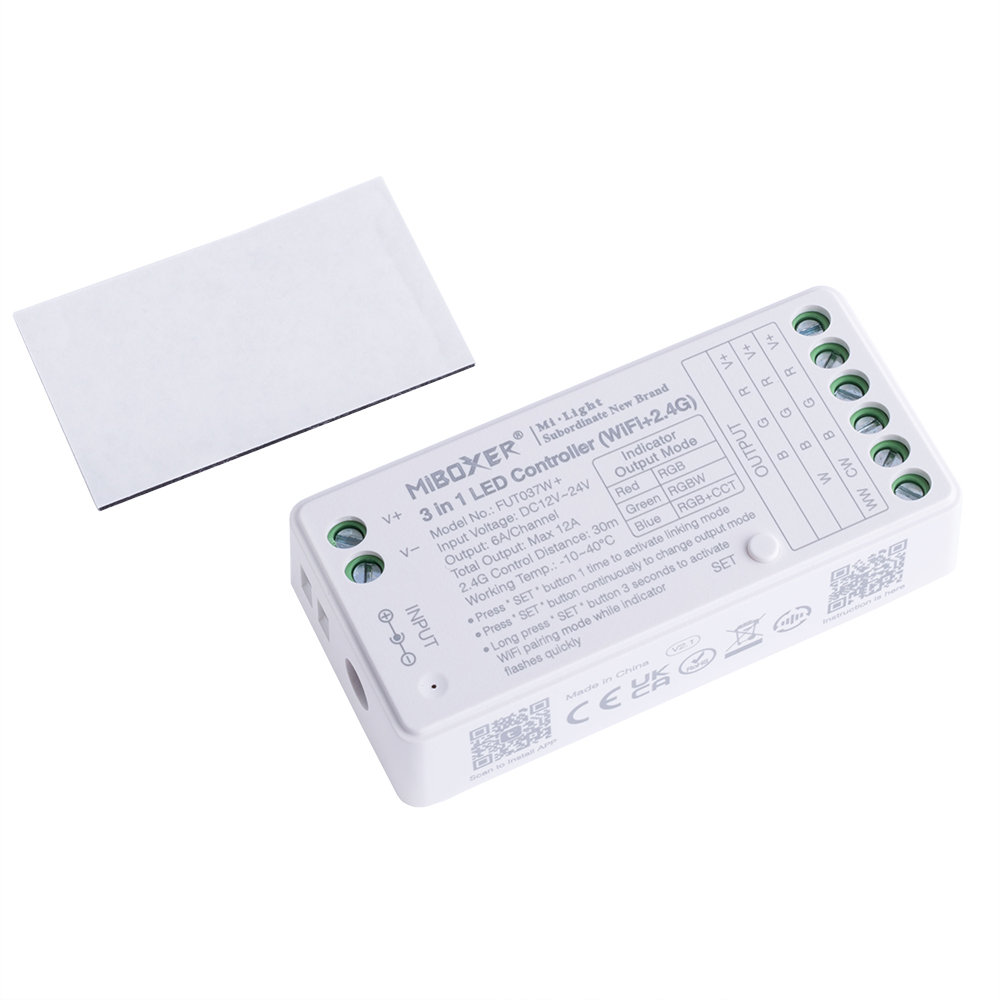 Beschreibung: Світлодіодний контролер 3в1 (2.4GHz RF: 30m). 3 можливі режими виходу: (RGB / RGBW / RGB + CCT). Сумісний з пультами Mi-Light/MiBoxer серії 2,4GHz. Підтримка голосового керування (потрібний шлюз 2,4 ГГц). Підтримує пульт DMX512. Можна використовувати разом з зовнішнім перемикачем. Регульована колірна температура та яскравість, RGB (16 мільйонів кольорів). Відстань дистанційного керування: 30 м. Один контролер може передавати сигнали з пульта дистанційного керування на інший контролер у межах 30 м. Живлення: 12...48VDC. Вихід: 10A на канал (20А на пристрій).